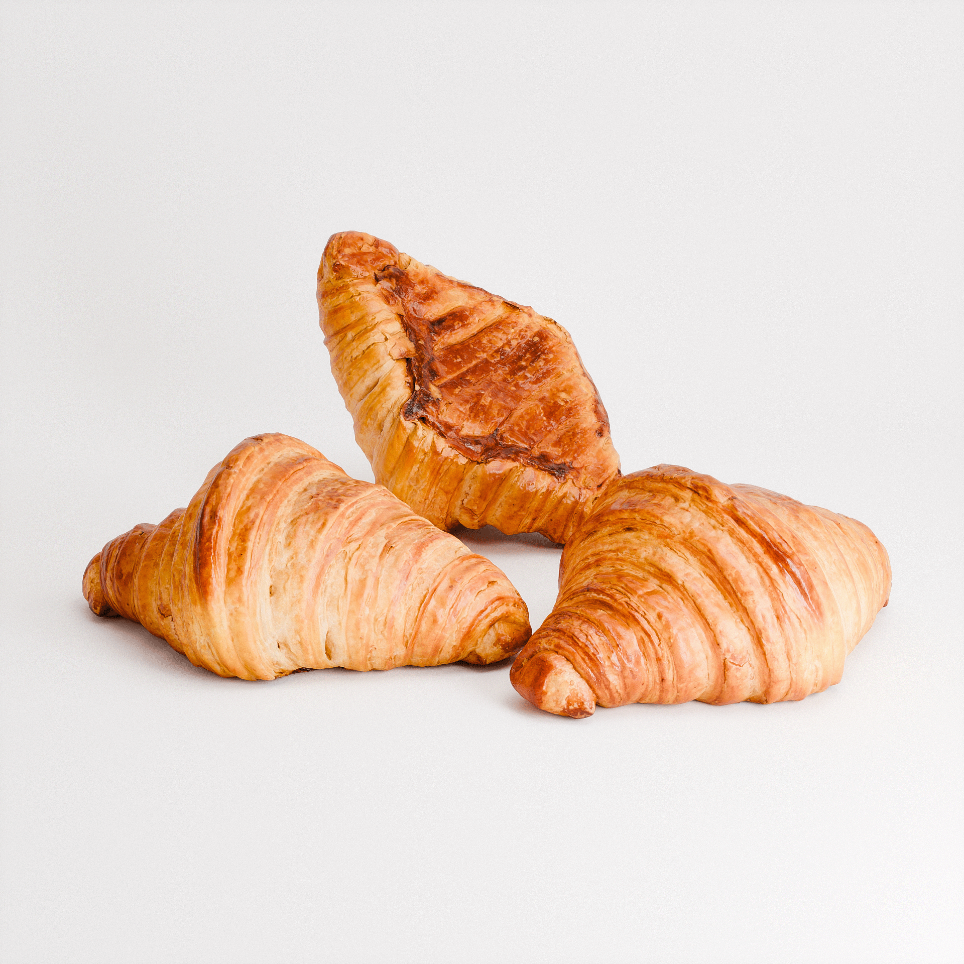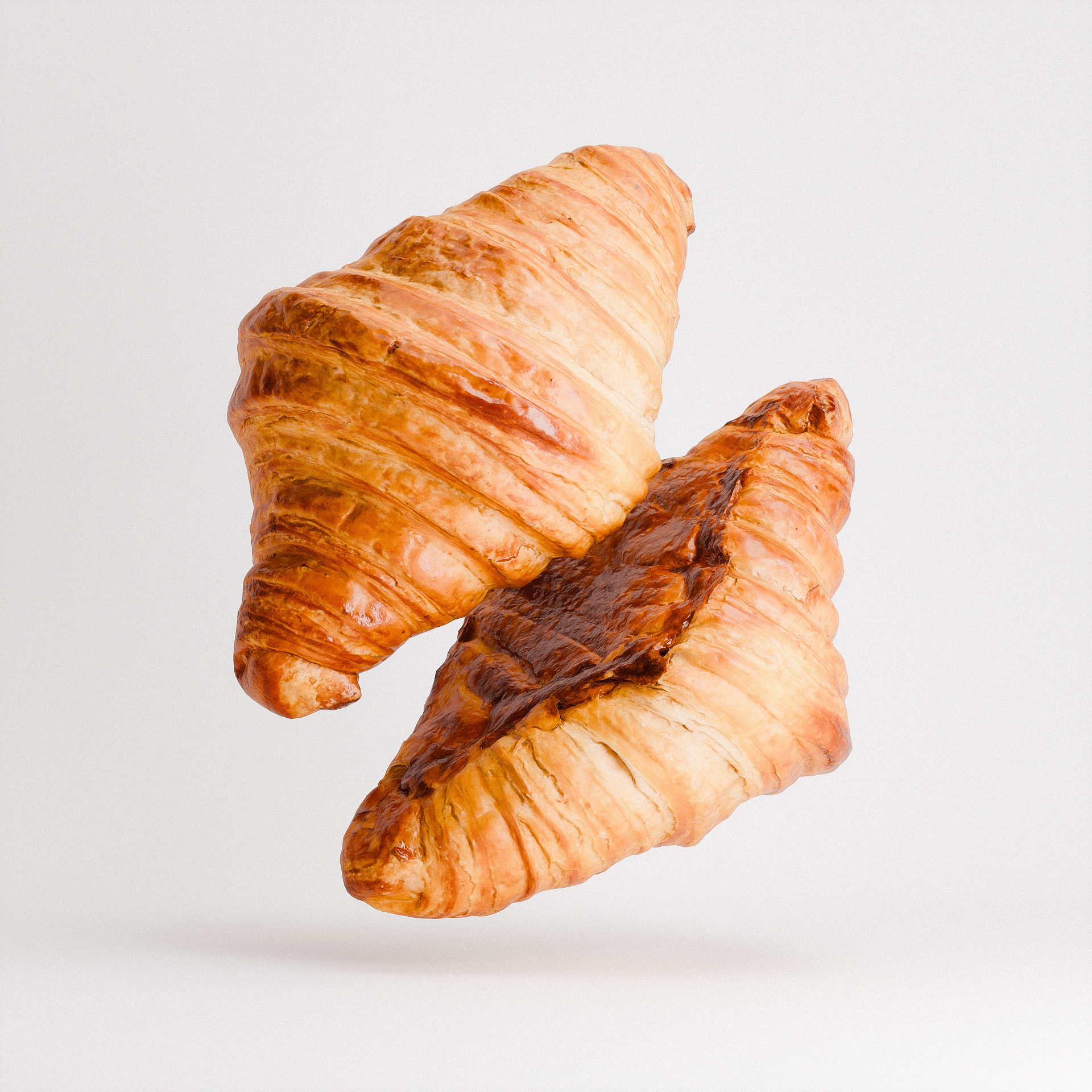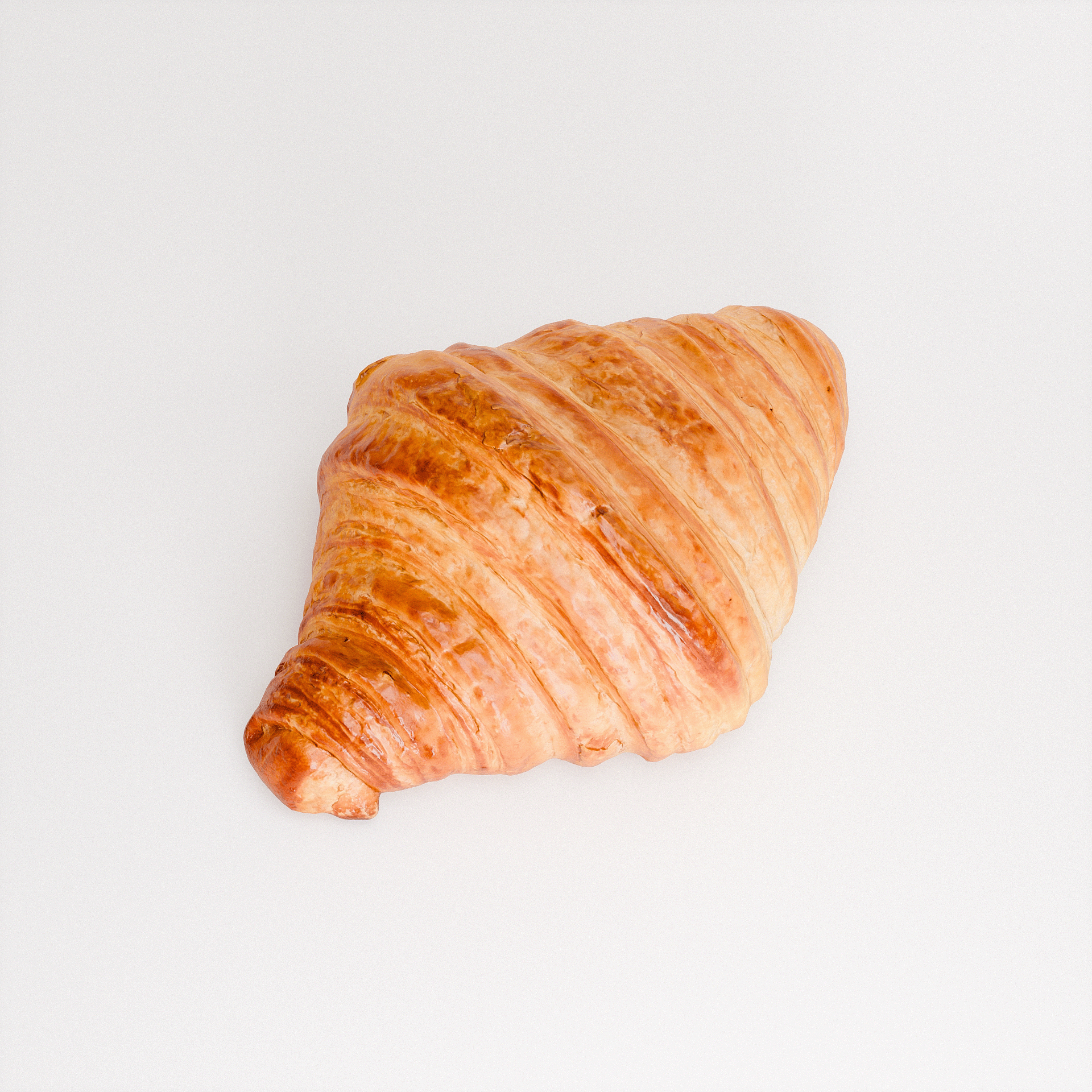 A single Butter Croissant evokes the warmth of a French boulangerie with its golden, flaky crust and soft, layered rise. The laminated dough is captured in delicate folds and rich variations of browns and caramels, with a subtle sheen hinting at a buttery finish. Well-suited to food styling, bakery visualizations, or product-focused scene work.