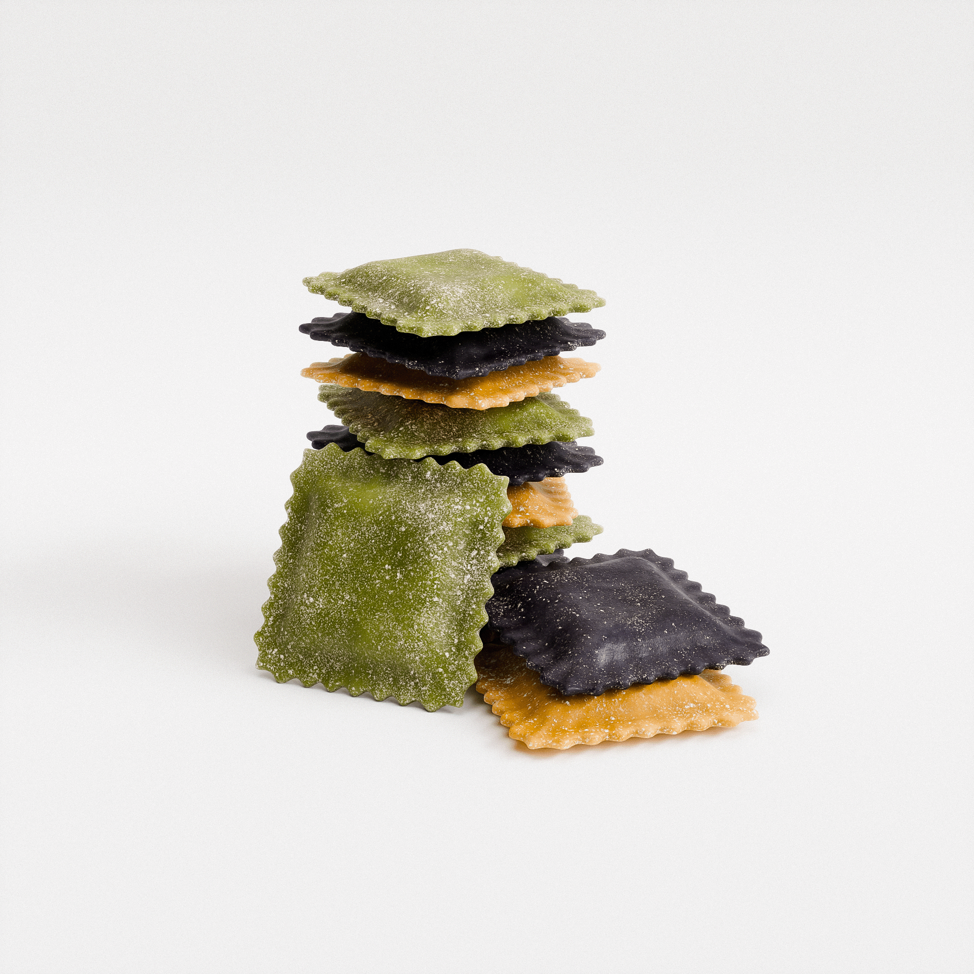 The trio’s subtle flour dusting and nuanced, authentic coloration highlight the tactile freshness of handmade dough. Perfect for food packaging renders, ingredient-focused visuals, or still-life compositions.