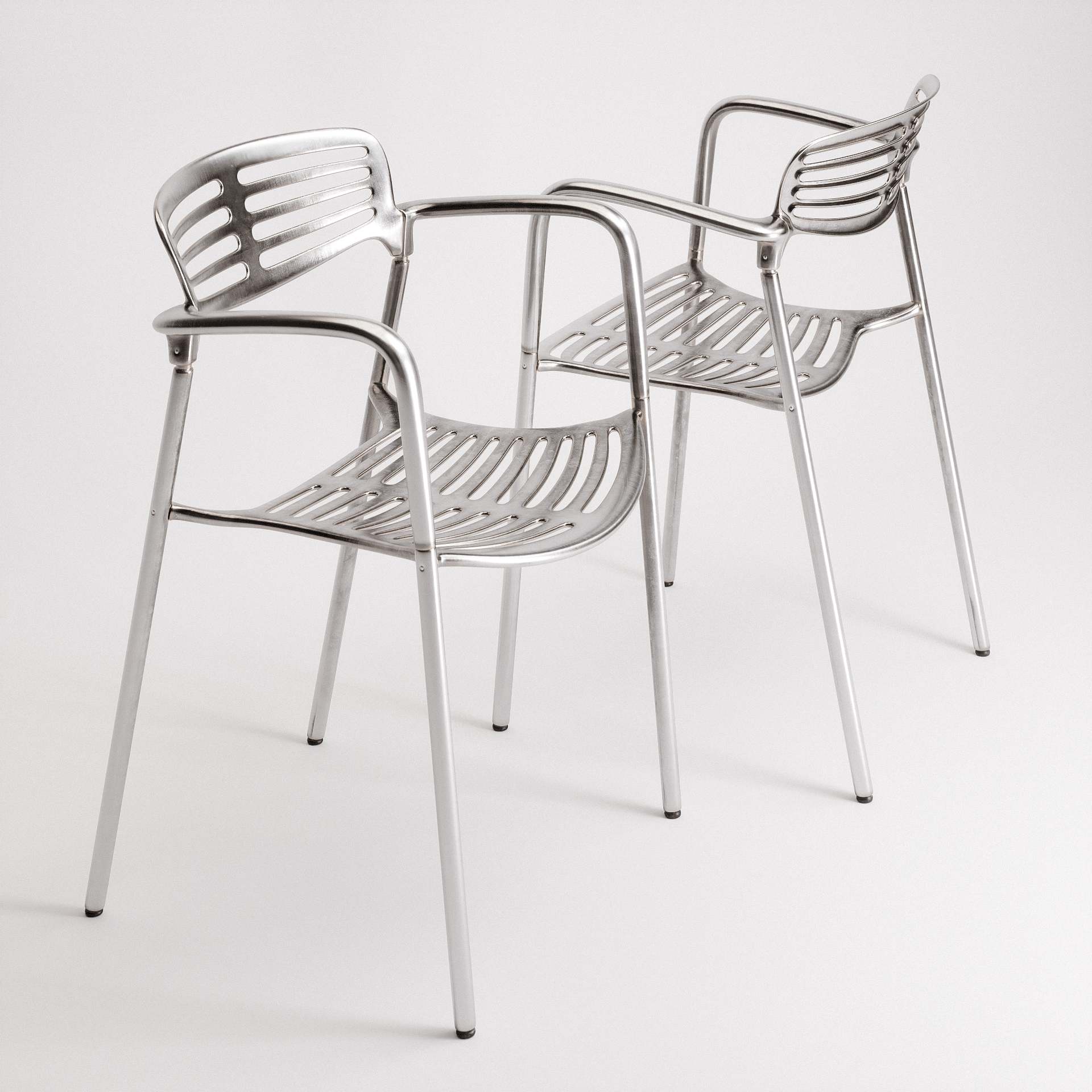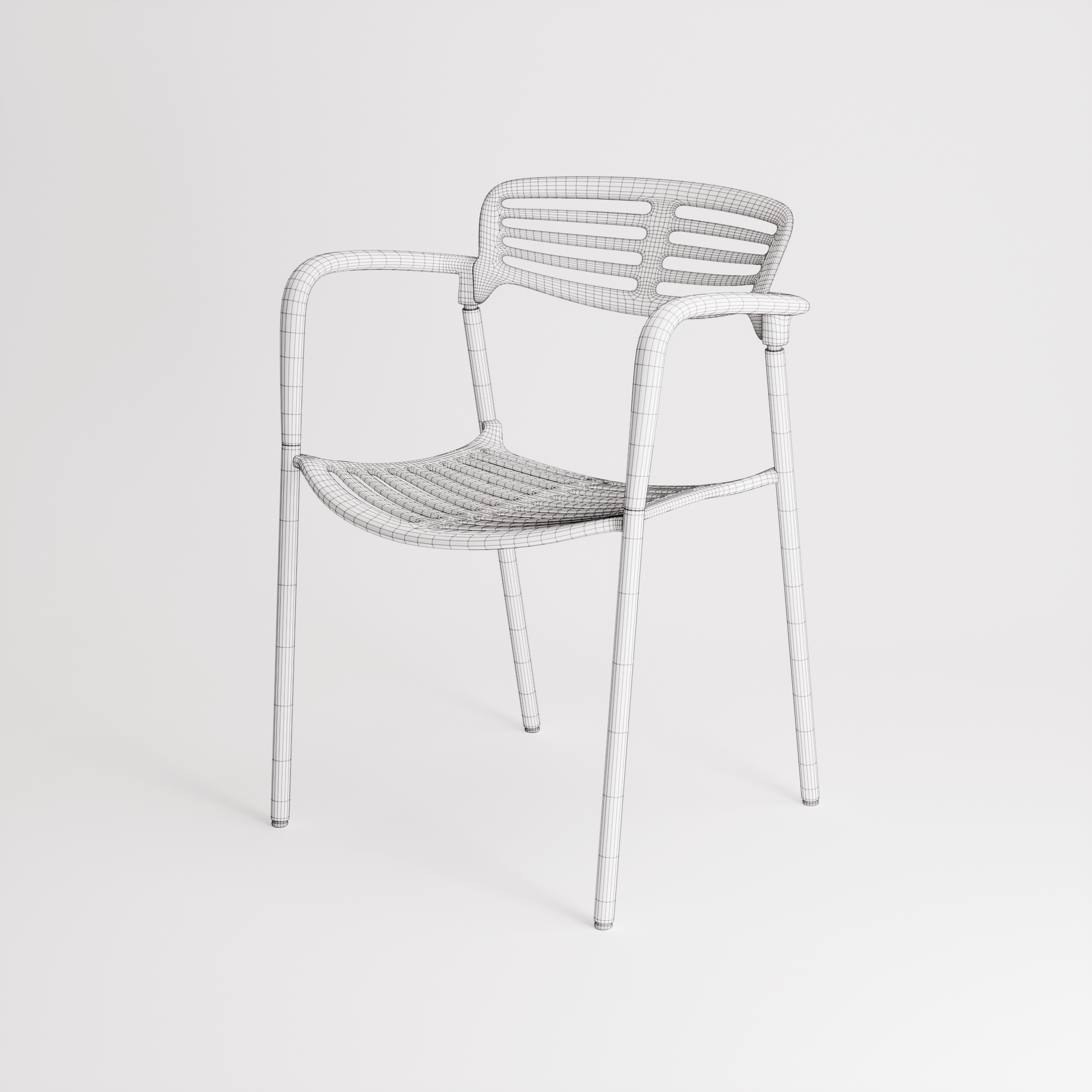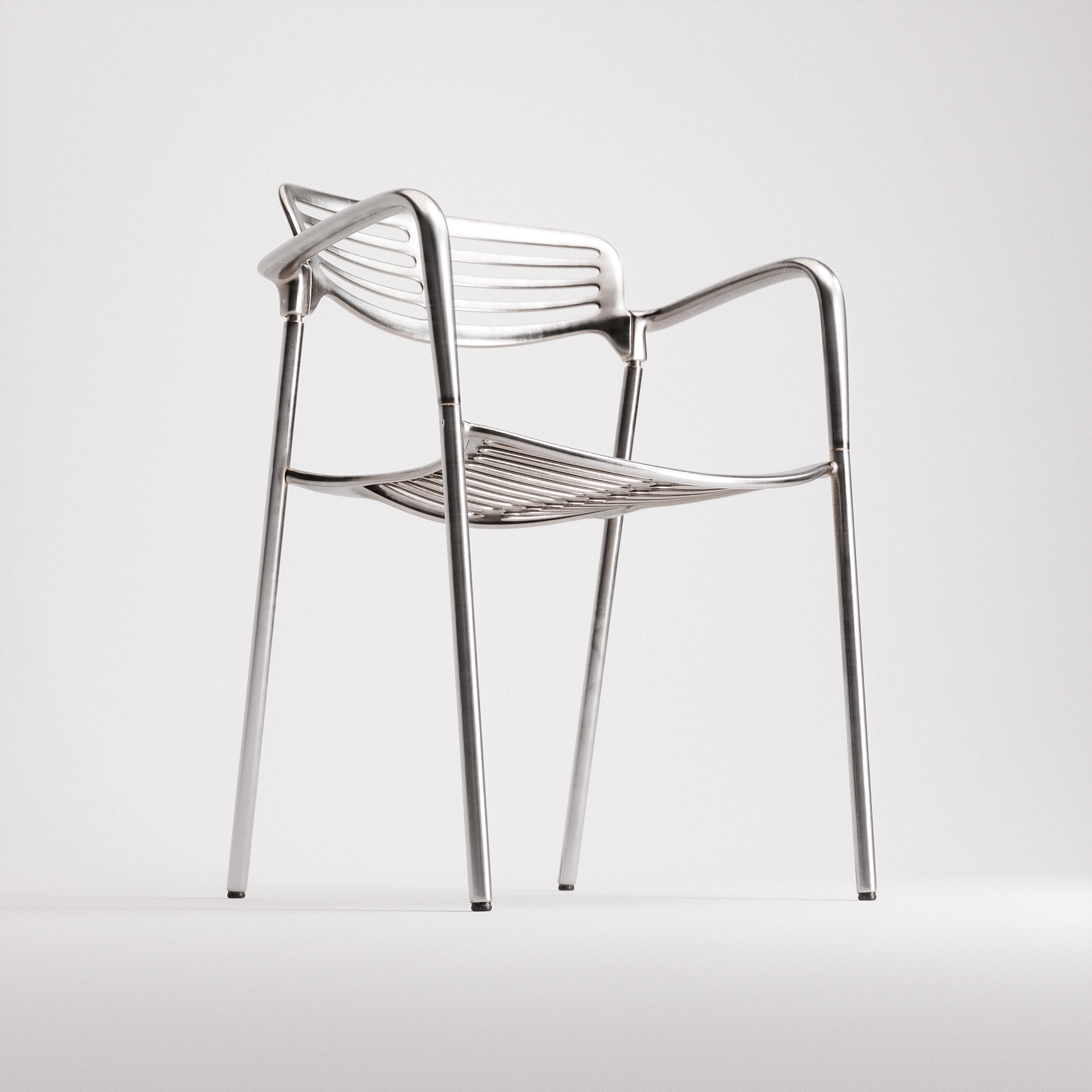 Streamlined and utilitarian, the Toledo Chair reflects a post-industrial design sensibility with its clean lines and perforated forms. The chair is constructed from brushed aluminum with a continuous tubular frame, offset by slotted backrest and seat panels that lend both visual rhythm and ventilation. A strong visual choice for architectural visualizations, exterior renders, or cafe scenes.