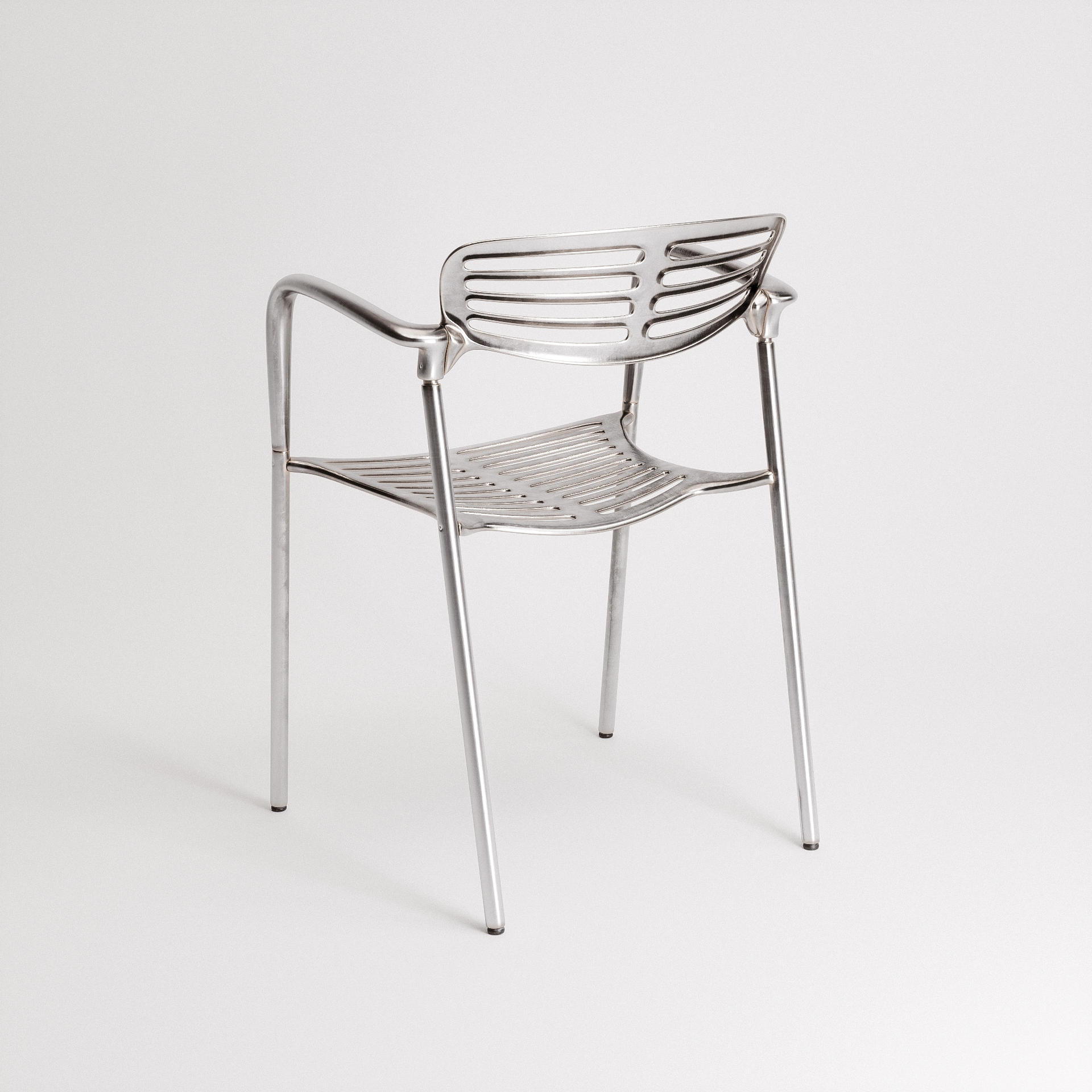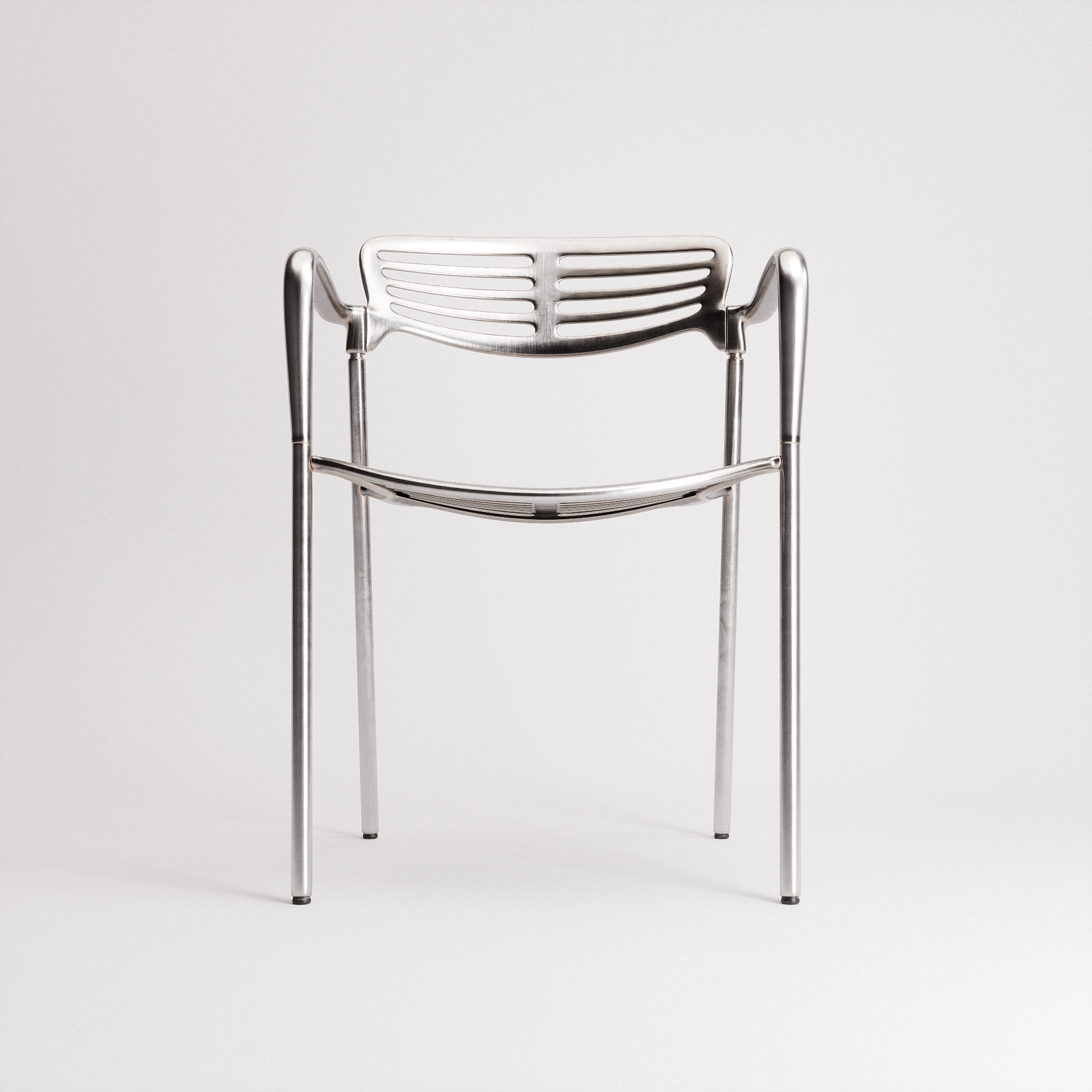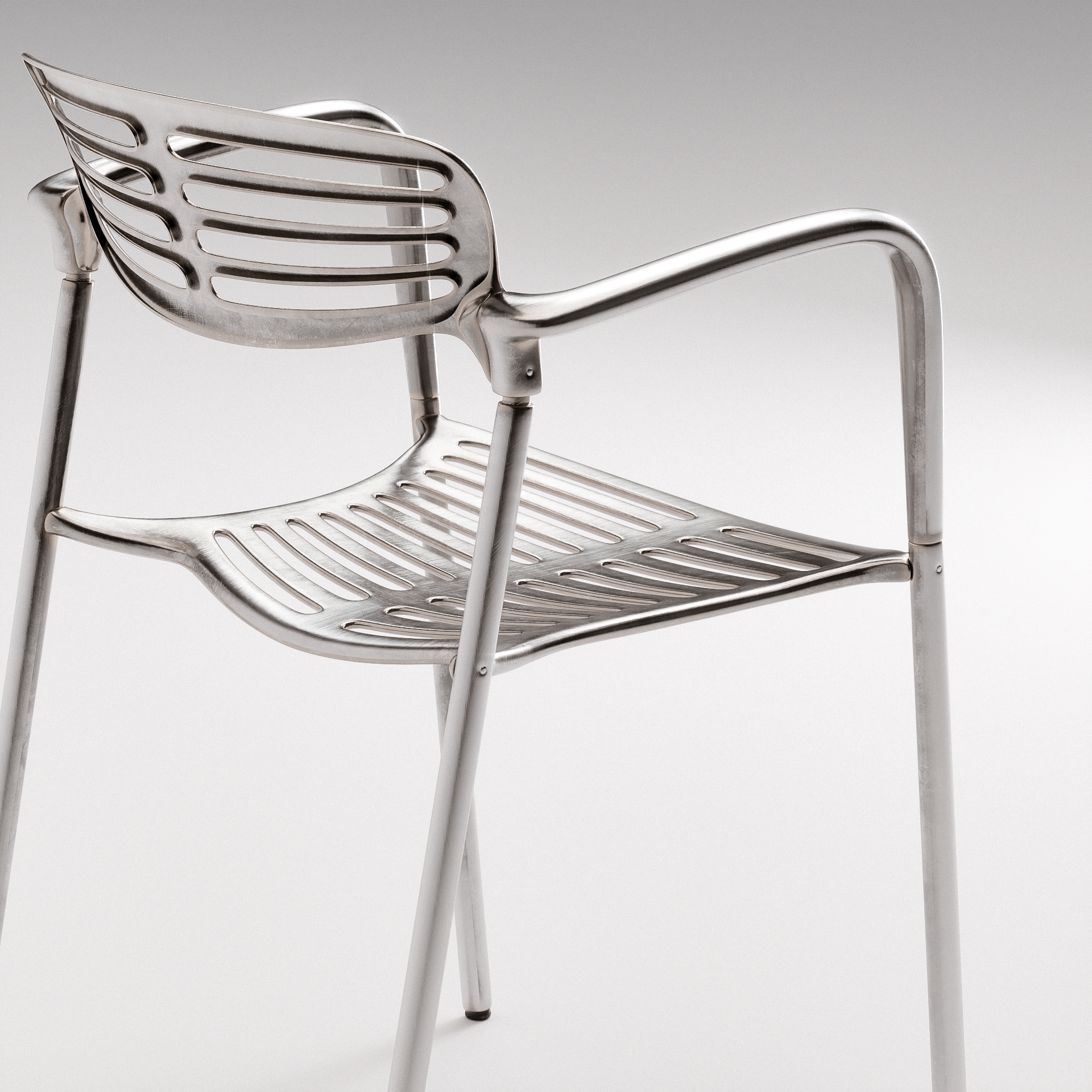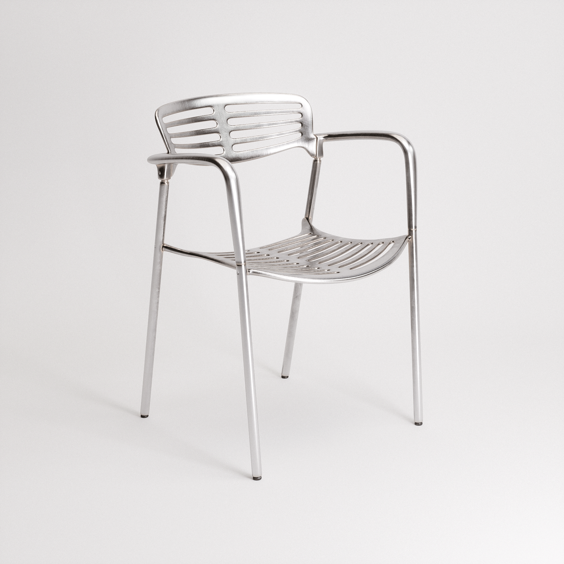 Streamlined and utilitarian, the Toledo Chair reflects a post-industrial design sensibility with its clean lines and perforated forms. The chair is constructed from brushed aluminum with a continuous tubular frame, offset by slotted backrest and seat panels that lend both visual rhythm and ventilation. A strong visual choice for architectural visualizations, exterior renders, or cafe scenes.